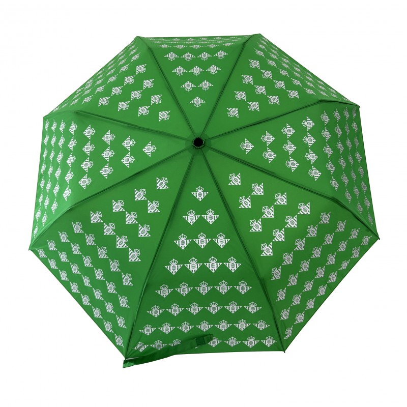 Paraguas plegable del Real Betis con apertura automática y estructura resistente al viento. Diseño oficial verdiblanco, práctico y duradero.