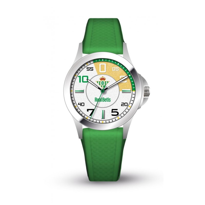 Reloj cadete del Real Betis con correa verde de silicona y esfera analógica con el escudo del club. Diseño deportivo, cómodo y perfecto para jóvenes béticos.