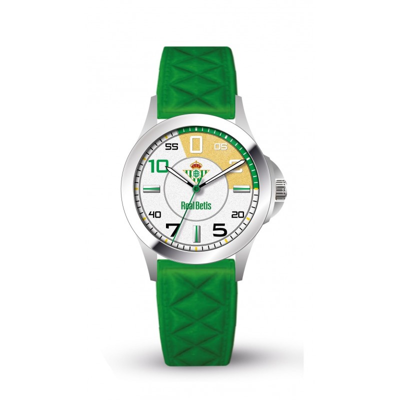 Reloj de caballero del Real Betis con correa verde de silicona y esfera analógica con el escudo del club. Deportivo, resistente y con estilo verdiblanco.