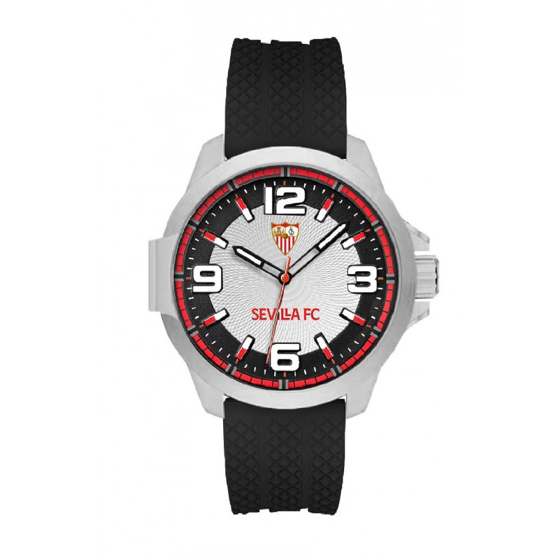 Este reloj de caballero del Sevilla FC destaca por su estilo deportivo y su presencia robusta, ideal para hombres que buscan un accesorio resistente y con identidad sevillista. Su correa negra de textura marcada ofrece un agarre cómodo y firme, perfecto para el uso diario.